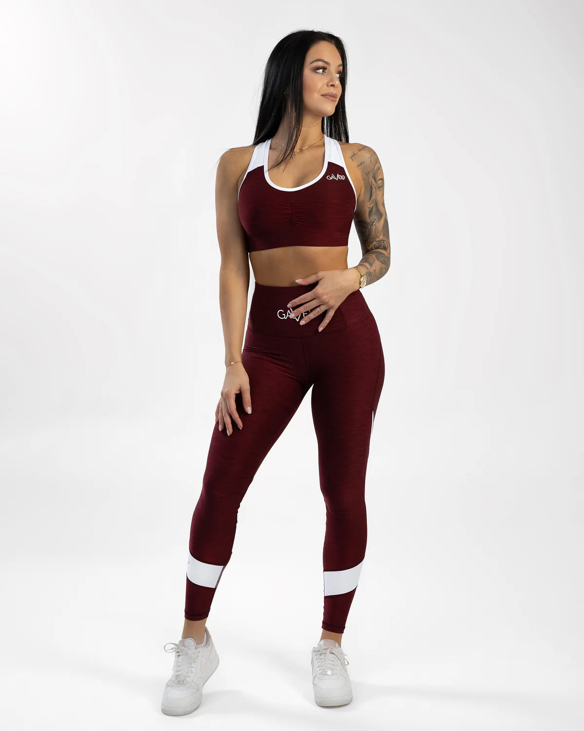 A stylish burgundy color in a thin, soft, and stretchy polyamide/spandex material with panels in white fabric.